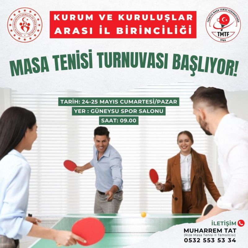 Kurumlar arasında çeşitli spor kategorilerinde düzenlenen turnuvalar Rize'de devam ederken Masa Tenisi Turnuvası İl Birinciliği 24-25 Mayıs tarihleri arasında Rize Güneysu Spor Salonunda gerçekleştirilecek.Kurum personelleri tarafından kurulan takımların karşılacağı turnuvaya tüm spor severler davetlidir.